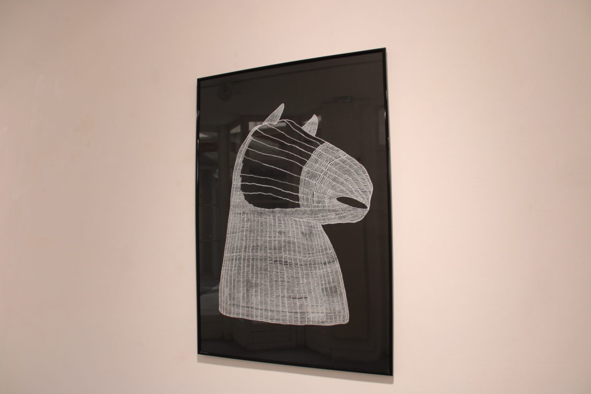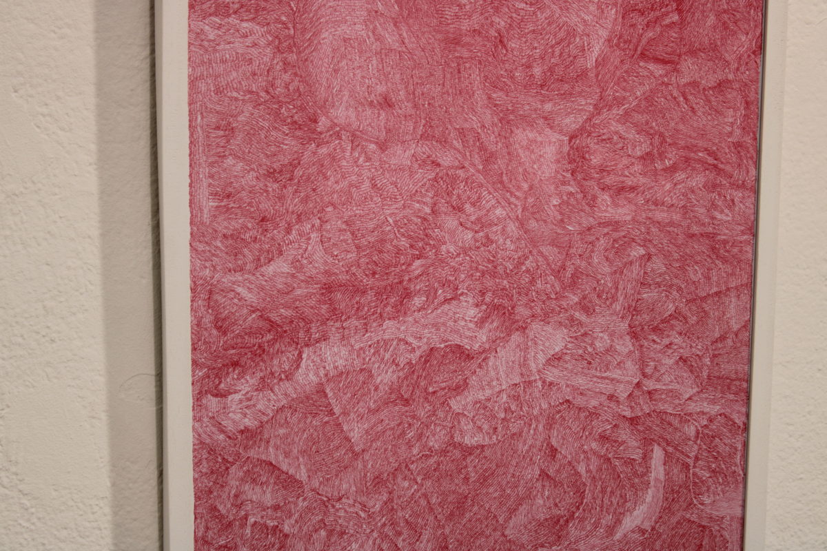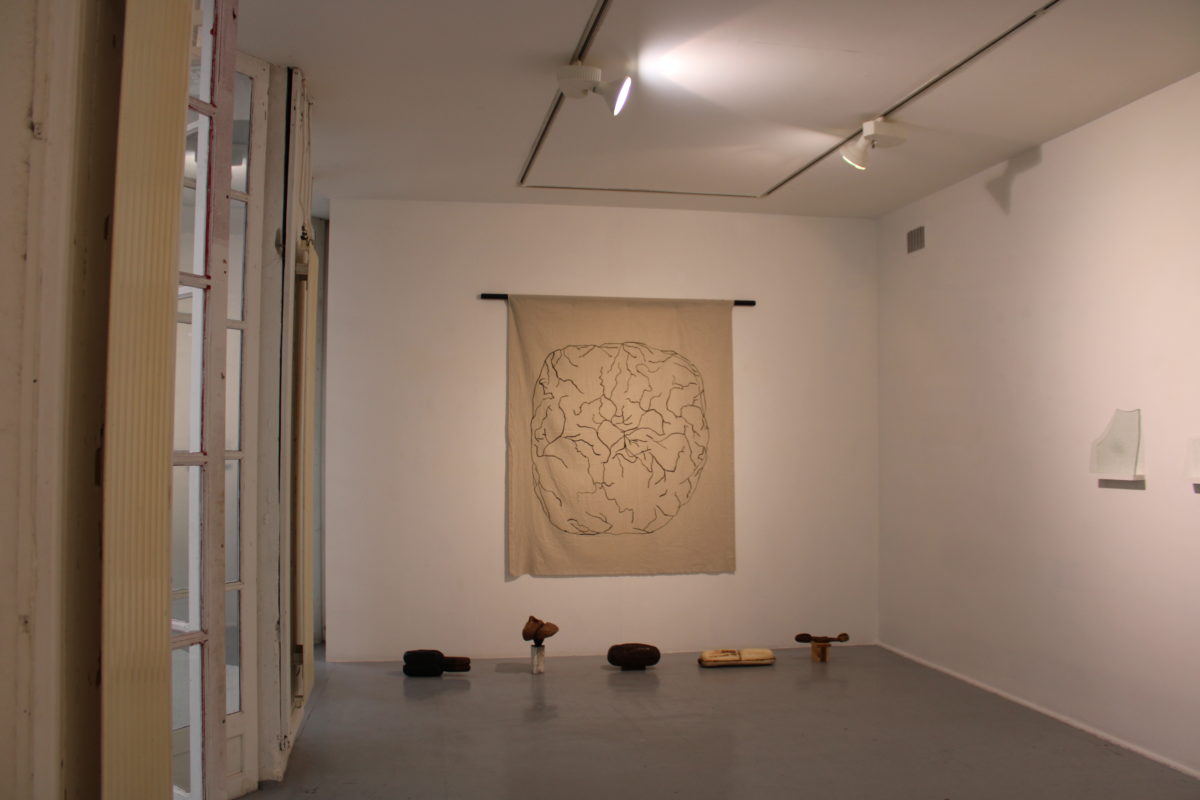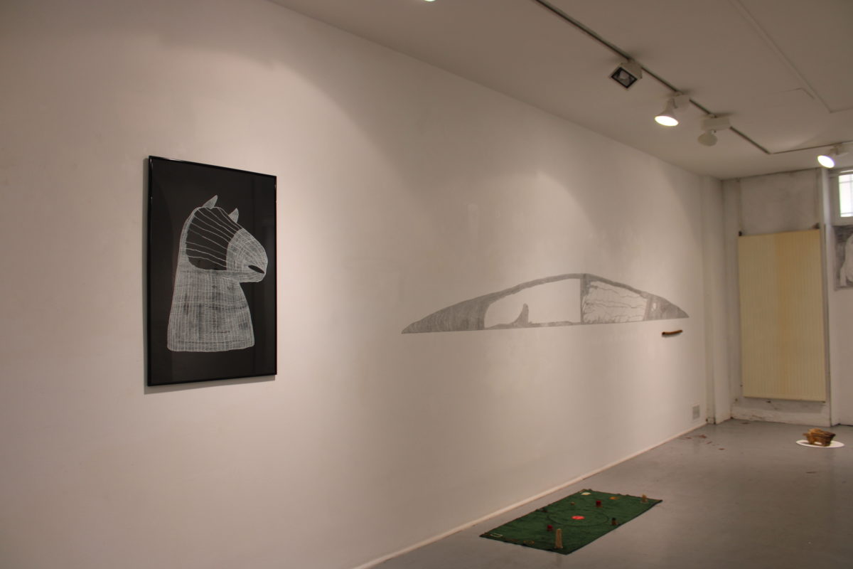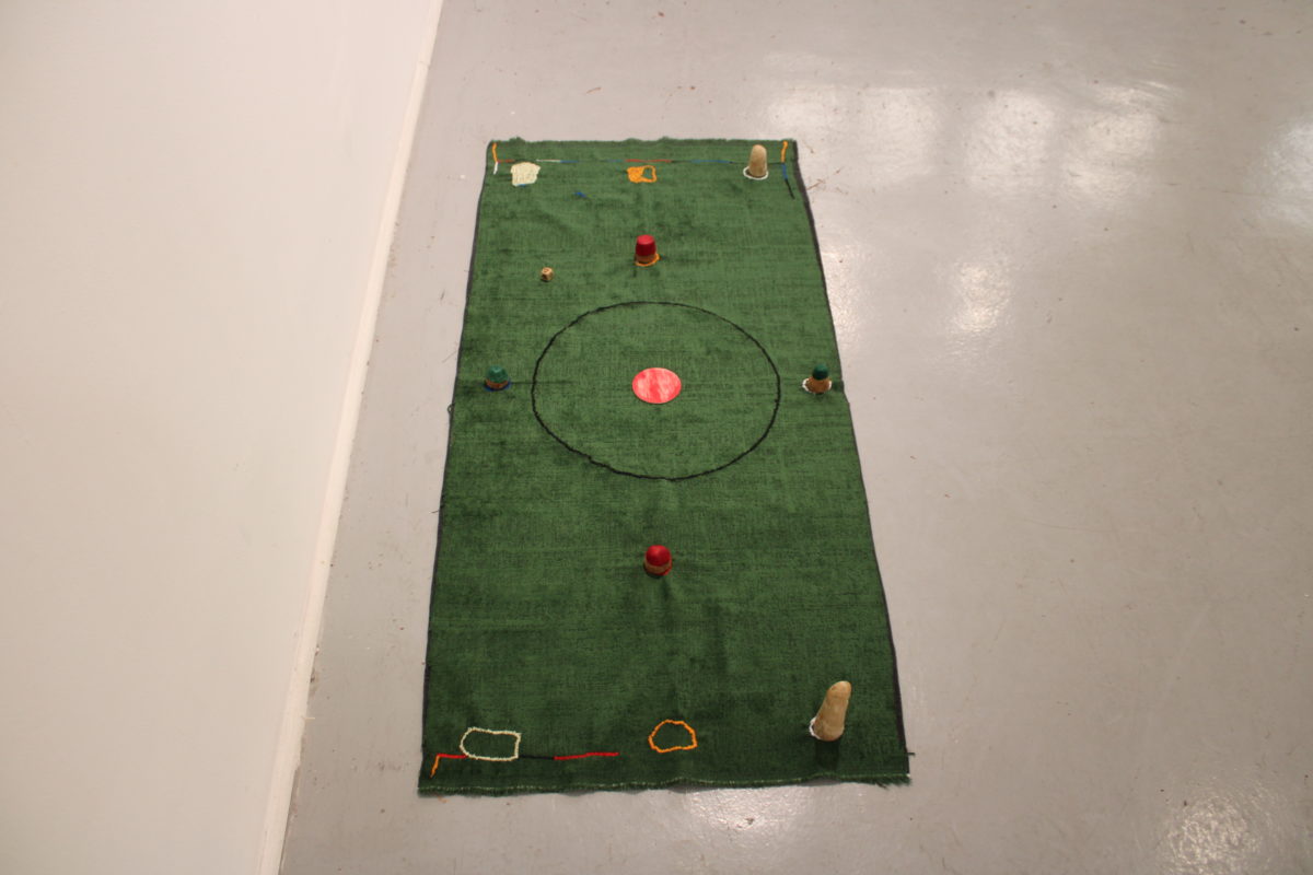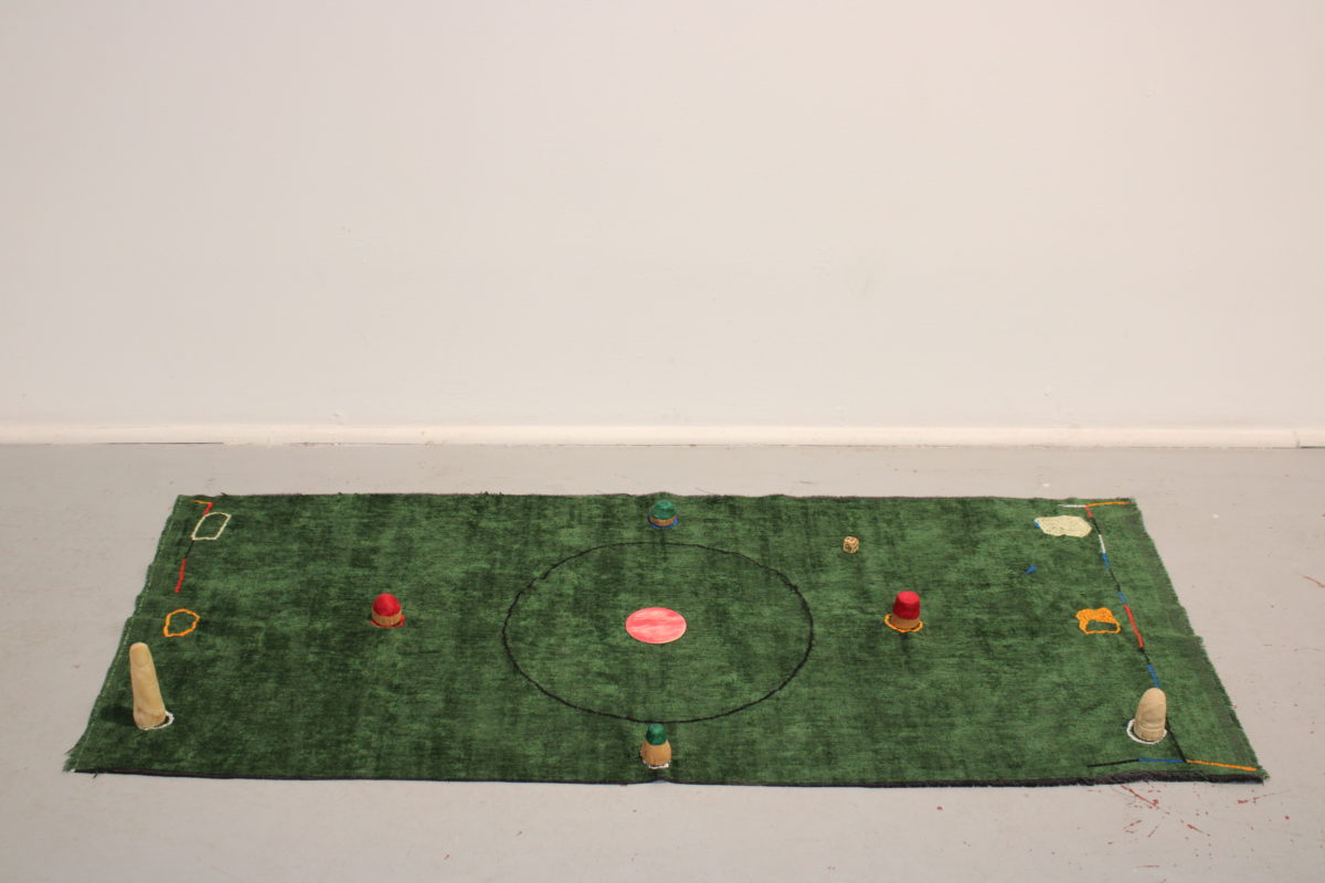 Des jeux ont été brodés sur un tapis. Des espaces de jeux, où l’on progresse à l’horizontale. C’est une exploration de la surface par le dessin et de ses infinis. Les images nous invitent à glisser de bords en bords, de traits en traits. Hors cadres, hors murs, hors sol.