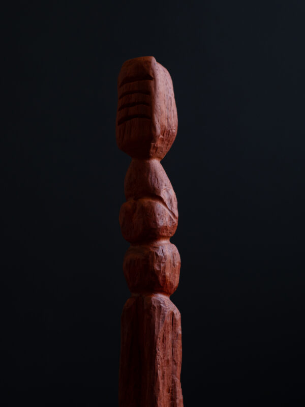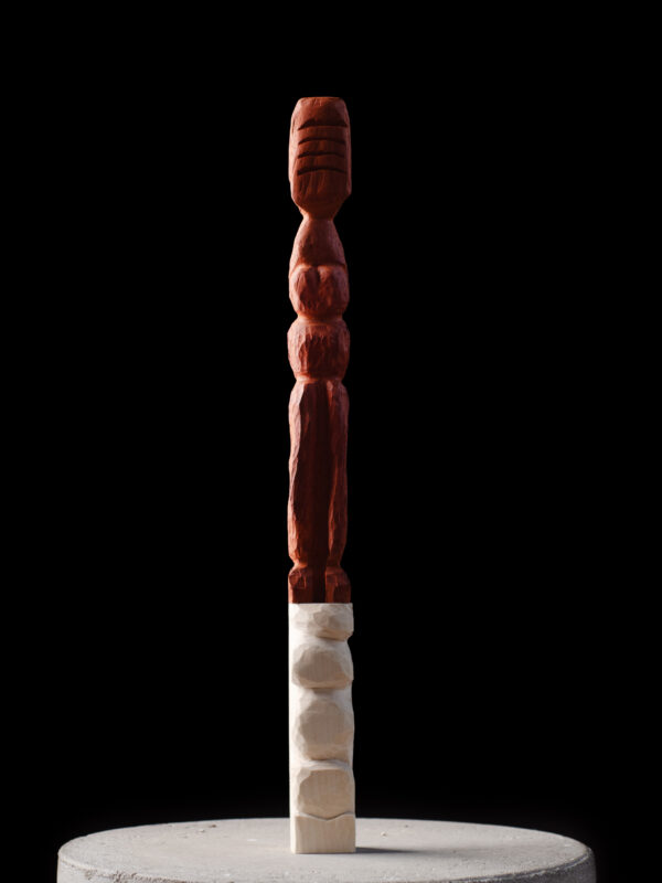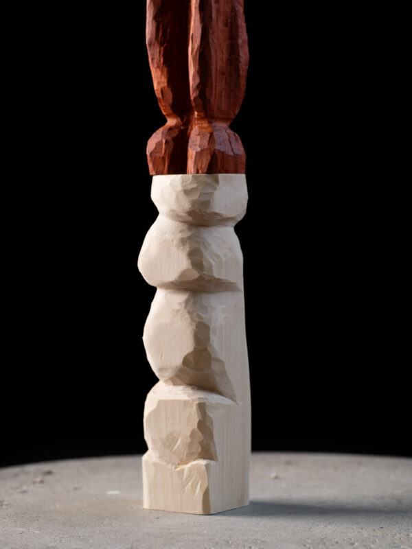 Il reste encore de la place pour la vacuité dans ce monde. Cette sculpture fait partie de mes œuvres récentes référant aux statuaires et au mysticisme. Prenant forme dans un bois exotique rouge, elle repose sur un socle de tilleul sculpté au couteau. Toujours brutes et organiques, ces sculptures reviennent à mes premières œuvres totémiques plus figuratives. Ici dans son unité nous retrouvons l’esprit des moines japonais Komuso. Je suis l’ombre de quatre colonnes.