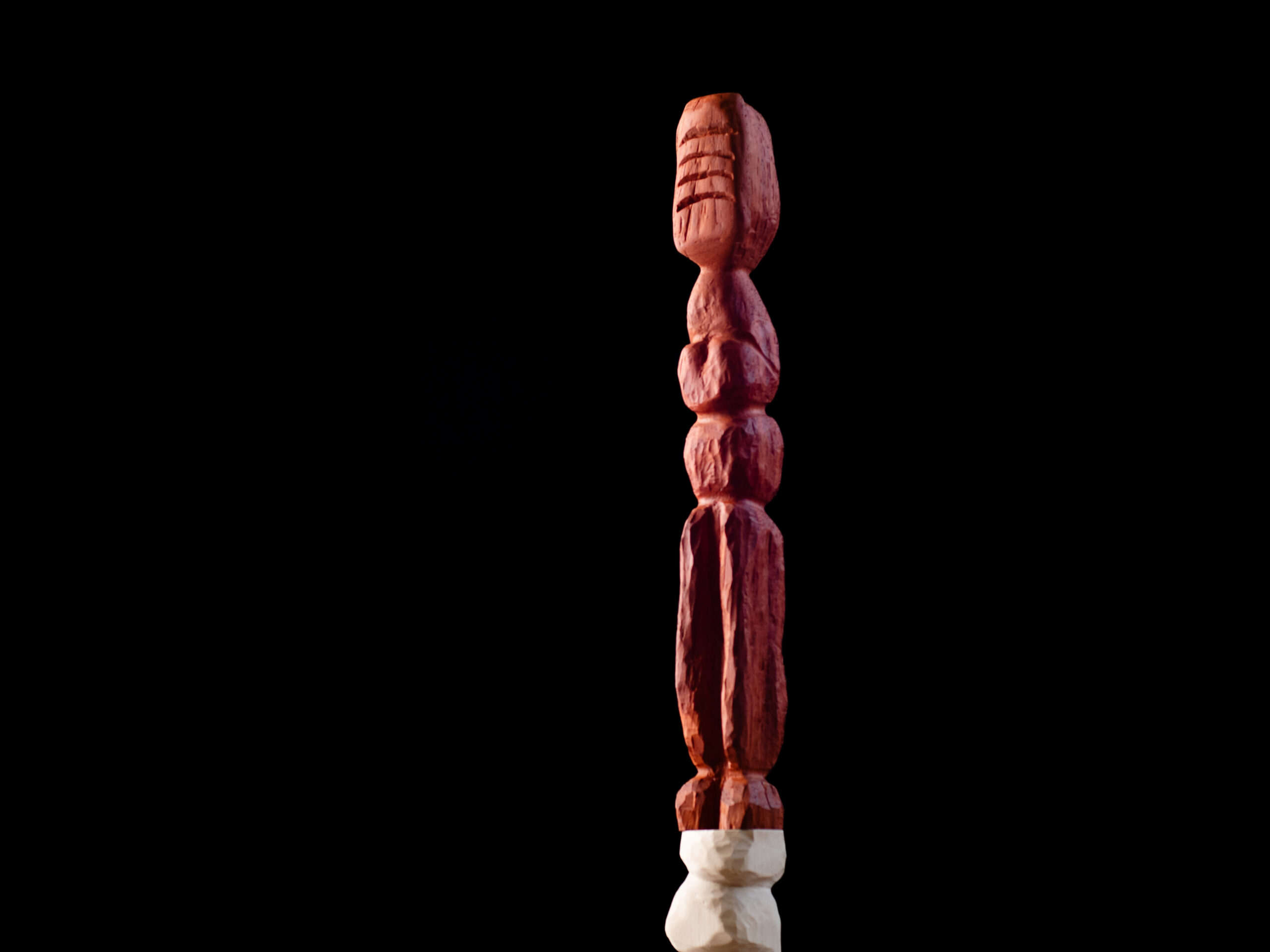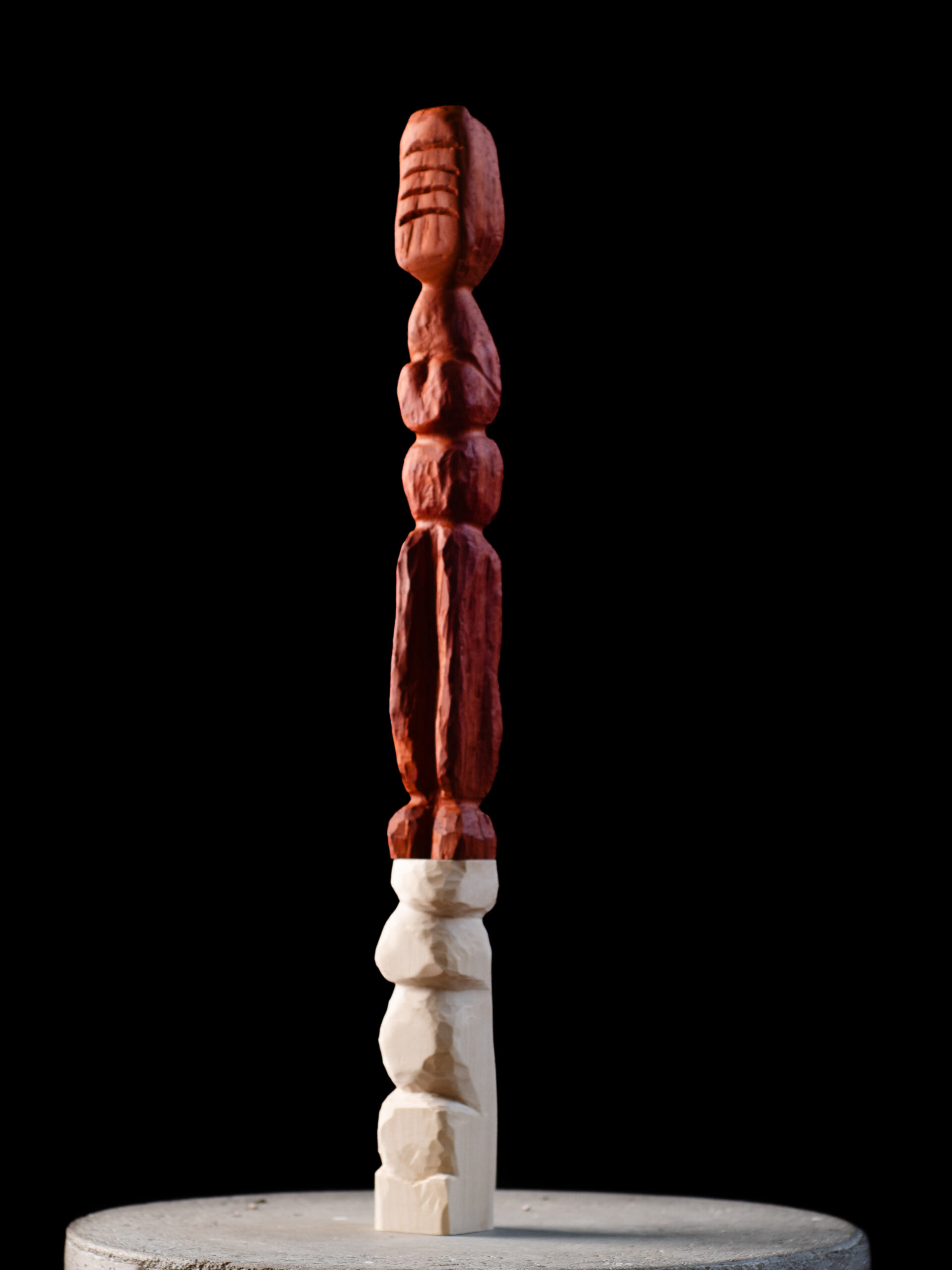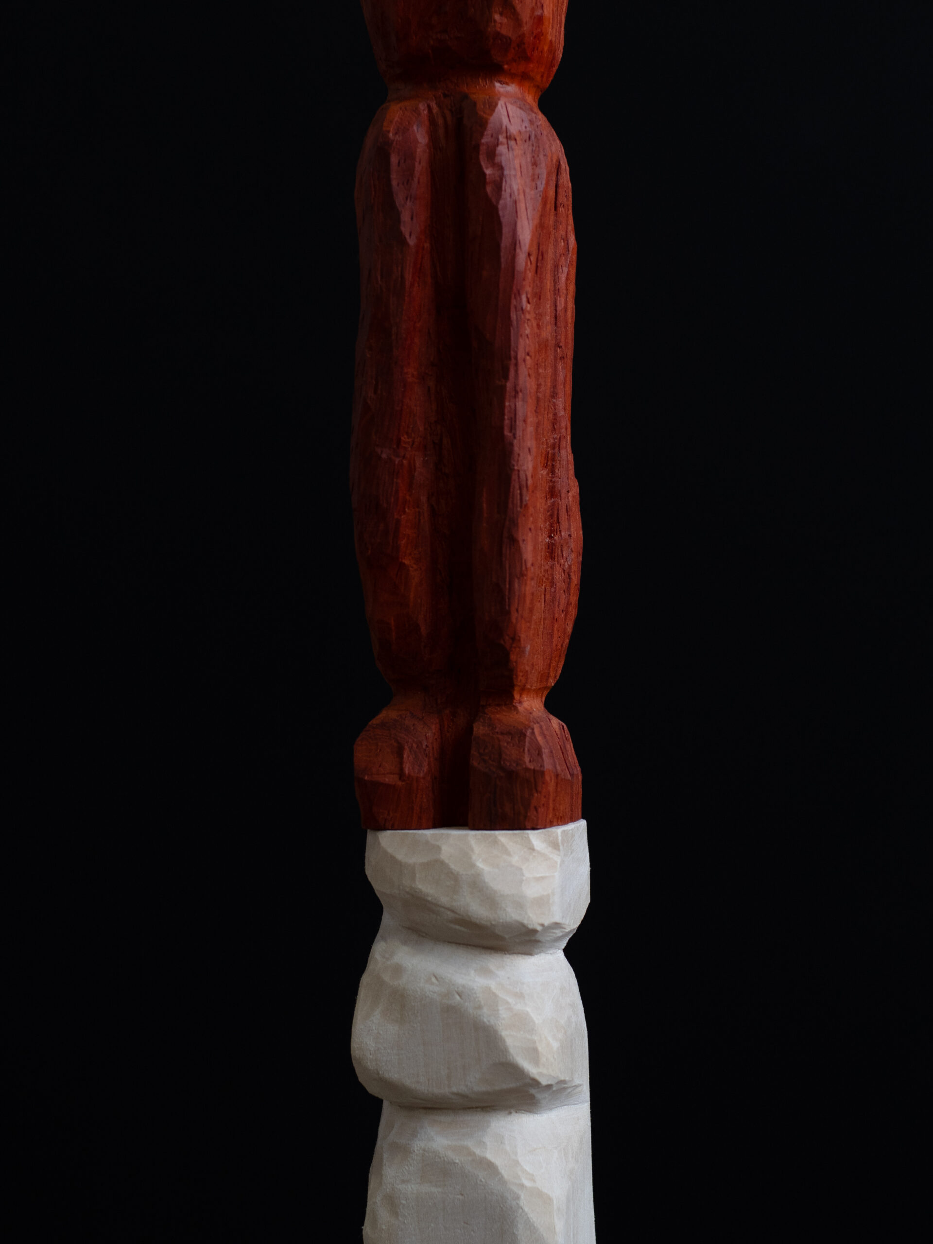Il reste encore de la place pour la vacuité dans ce monde. Cette sculpture fait partie de mes œuvres récentes référant aux statuaires et au mysticisme. Prenant forme dans un bois exotique rouge, elle repose sur un socle de tilleul sculpté au couteau. Toujours brutes et organiques, ces sculptures reviennent à mes premières œuvres totémiques plus figuratives. Ici dans son unité nous retrouvons l’esprit des moines japonais Komuso. Je suis l’ombre de quatre colonnes.