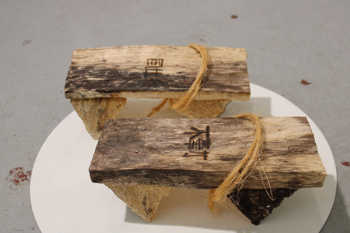 2020, 28x12x30 cm, sculpture en bois de Tremble pyrogravé, corde. (crédits photos Carlos Bernal)