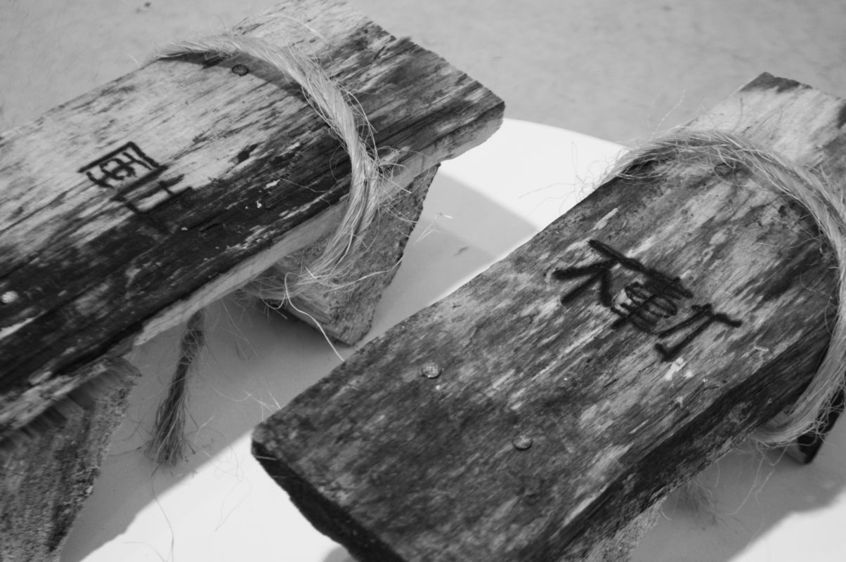 Basé sur un modèle de chausses traditionnelles japonaises (geta) en bois, ces sandales ont un double statut, celui de sculpture et de chaussures. Avec un aspect archaïque, elles semblent ne pas être utilisable, leur conception est faite de bois bruts de Tremble rongé par les vers qui a été fendu puis assemblé en sandale de manière simple. Une cordelette permet de les faire tenir aux pieds. Par leur forme, elles sont adaptés au milieu, un milieu naturel ou l’homme doit se parer de la nature pour survivre. Elles sont donc faite pour être utilisées dans le milieu qui a permis leurs conception, la forêt humide.