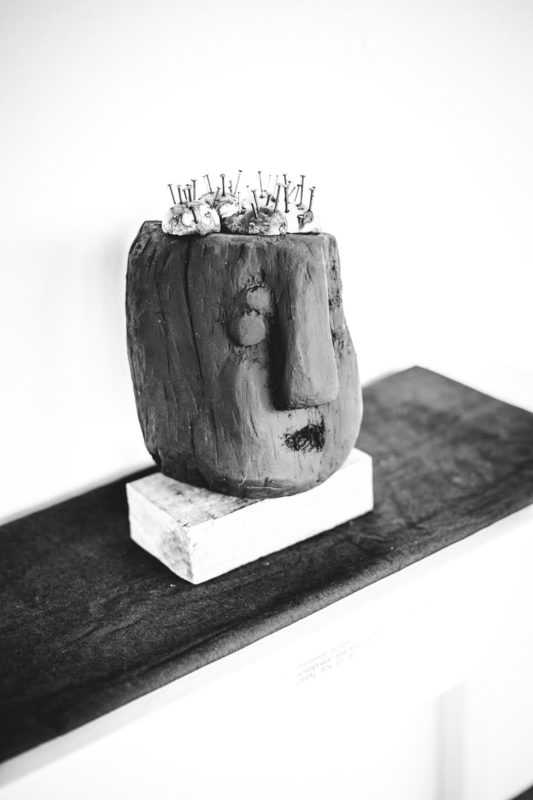 Sculpture sur le corps entravé et mutilé réalisée sur une racine de bois sec, elle met en avant l’aspect de la croissance d’un corps entravé par les chaînes ou des éléments qui empêchent et modifient son évolution physique. Ici, il est question du corps humain et des mutilations corporelles qui étaient appliquées aux esclaves et aux prisonniers. Cette pièce rend hommage au handicap et à la différence.